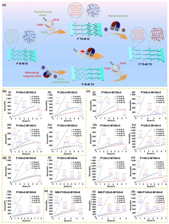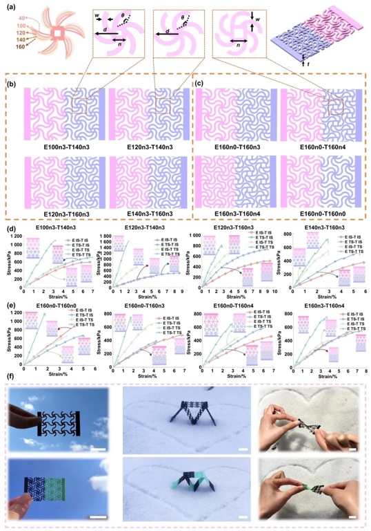 5. 梯度超材料的高可编程力学性能图,通过力学性能测试与分析的方法,研究了四韧带梯度超材料在不同刺激下的力学性能变化及可编程机制。结果表明,超材料的力学性能可通过选择性驱动实现灵活调控,如从初始形状到临时形状的转变可使拉伸强度显著提高,且韧带角度差、节点大小等因素影响性能变化幅度。