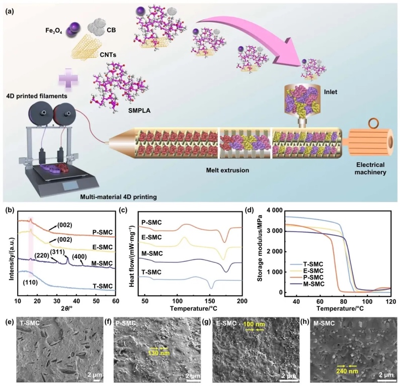 2. 多响应4D打印形状记忆复合材料的制备与表征图,通过实验制备与表征分析的方法,研究了光响应、电响应、磁响应和热响应的形状记忆复合材料的制备过程及其性能。结果显示,添加碳纳米管、炭黑和四氧化三铁等功能填料可改善复合材料的结晶度、热性能和力学性能,且各复合材料具有不同的玻璃化转变温度和微观形貌。