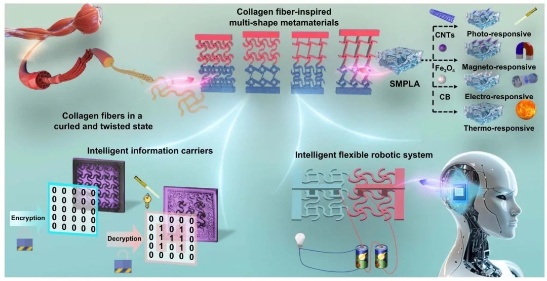 1. 4D打印多形状梯度超材料的设计原理与应用示意图,通过构建示意图的方法,研究了4D打印多形状梯度超材料的设计原理及其在智能信息载体和智能柔性机器人系统中的应用。结果表明,该超材料通过整合热、光、电、磁响应的形状记忆聚合物纳米复合材料,实现了多形状记忆效应和时空可控的选择性驱动,为多功能器件开发提供了新思路。