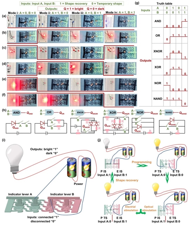 8. 基于多响应梯度超材料的可变刚度逻辑电子器件图,通过器件设计与功能验证的方法,研究了基于多响应梯度超材料的可变刚度逻辑门器件的设计及其逻辑运算功能。结果显示,该器件可通过刺激调控实现刚性与柔性的自由切换,准确执行与、或、异或等逻辑运算,为智能柔性机器人系统的集成传感-驱动-决策功能提供了可能。