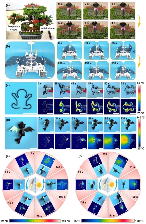 3. 4D打印形状记忆复合材料的可编程刺激响应性图,通过实验验证的方法,研究了4D打印形状记忆复合材料在光、电、磁等刺激下的可编程形状记忆性能及选择性驱动能力。结果表明,复合材料可实现快速、高效的形状恢复,且通过多材料组合能实现时空选择性驱动,如光/热双刺激下不同区域的独立响应。