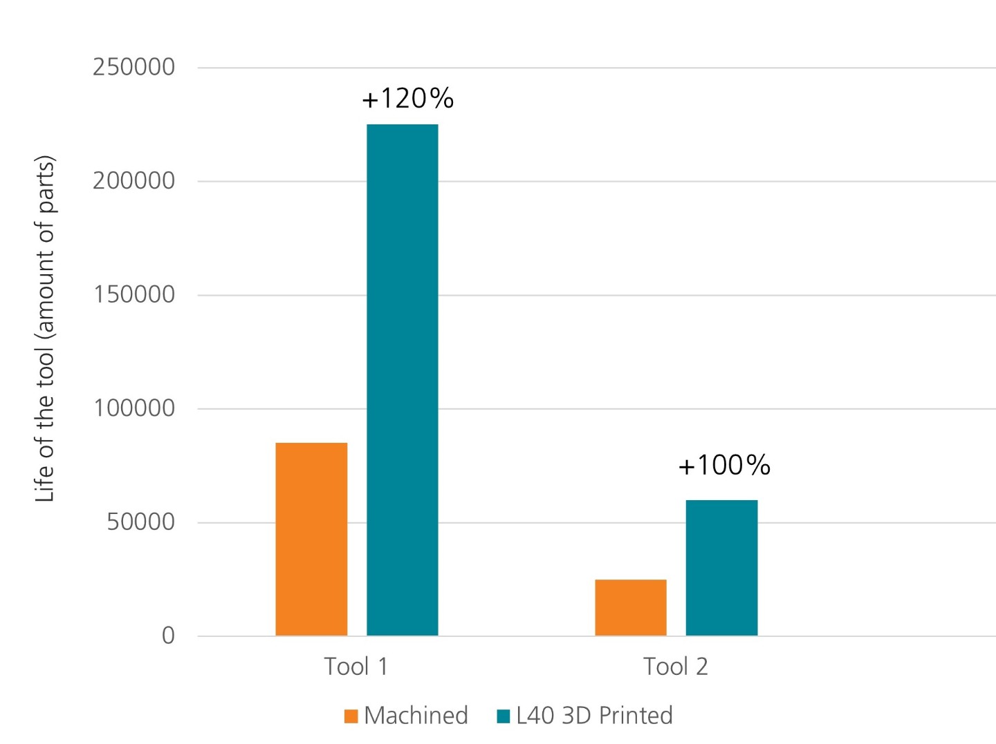 △采用L-40 材料的传统制造工具与增材制造工具的使用寿命比较。图片来自弗劳恩霍夫激光技术研究所。