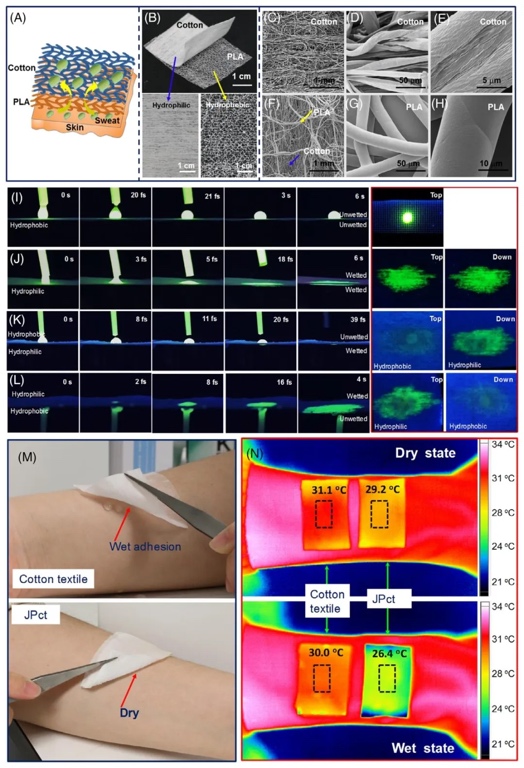 6. Janus PLA-棉纺织品(JPct)的单向导液图,通过在亲水棉织物上打印疏水PLA微纤维网格,构建双层结构。结果显示,JPct可将水滴单向传输至棉层,即使从疏水侧接触也能穿透,且在干/湿状态下均表现出优于纯棉的隔热性能,实现皮肤温湿度管理。