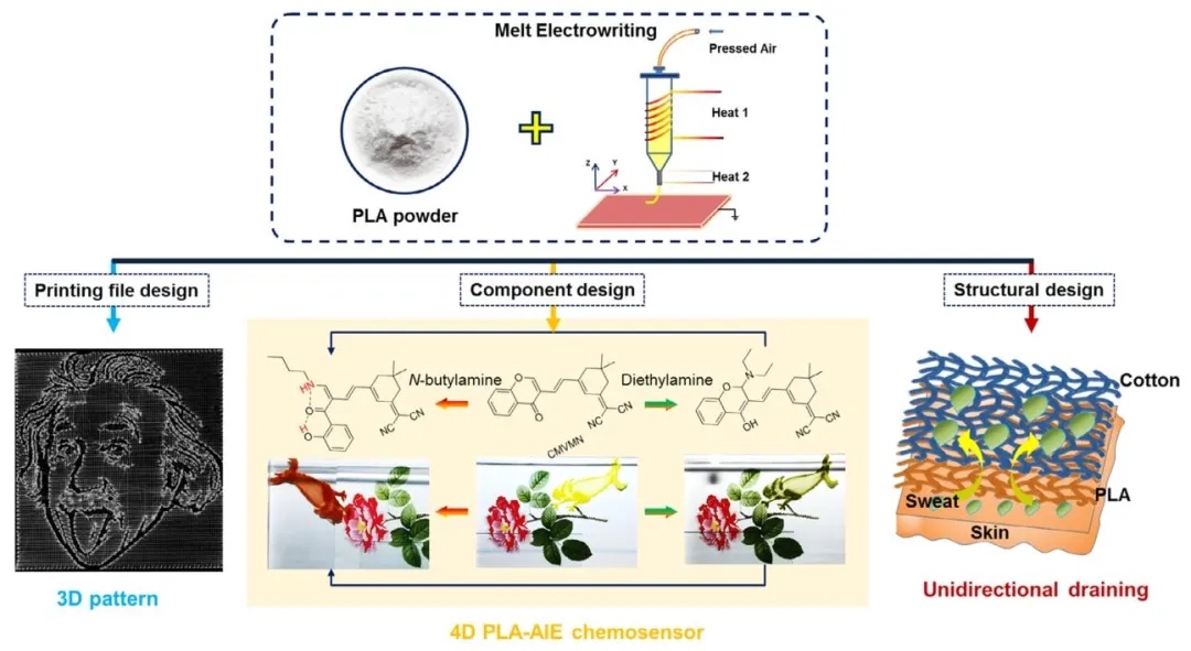 纤维基可穿戴器件在显示、化学传感和生物流体管理等领域应用广泛,但传统合成聚合物纤维(如PET、PP)不可降解,会导致环境污染并威胁生物健康,天然可降解材料(如PLA)面临着在常规3D打印中(如FDM)打印精度低、在电纺丝过程中又难以形成可控结构的问题,限制了PLA基多功能可穿戴器件的发展。香港城市大学吕坚院士、香港中文大学(深圳)唐本忠院士和复旦大学彭琛副研究员团队合作,通过整合可降解聚乳酸(PLA)与熔融电纺丝直写(MEW)技术,开发出兼具类刺绣图案、AIE化学传感及生物流体单向导液功能的纤维基可穿戴平台。该平台利用MEW高打印精度优势构建PLA微纤维结构,通过组件设计和结构优化实现多功能集成,解决了传统材料的环境与性能痛点。功能的纤维基可穿戴平台。该平台利用MEW高分辨率优势构建PLA微纤维结构,通过组件设计和结构优化实现多功能集成,解决了传统材料的环境与性能痛点。相关工作以“3D/4D printed versatile fibre-based wearables for embroidery, AIE-chemosensing, and unidirectional draining”为题发表在《Aggregate》上。论文第一作者为香港城市大学的刘朋超博士,通讯作者为复旦大学彭琛副研究员、香港中文大学(深圳)唐本忠院士和香港城市大学吕坚院士。