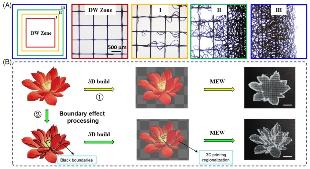 3. PLA图案打印文件生成图,利用MEW中的边界效应和3D Builder软件将2D图像转换为3D模型,通过划分边界区域优化打印路径。结果表明,该方法可将2D图案转化为具有生动细节结构的3D打印图案,相比直接的2D图案打印,图案区域化更精准。