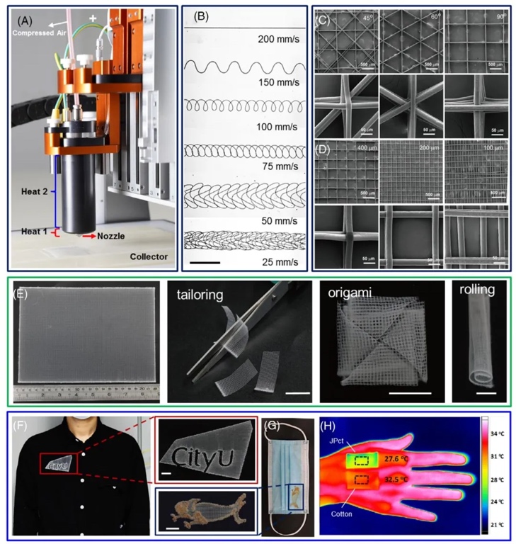 2. PLA微纤维与网格的制备及表征图,利用MEW技术在双温区控制(150℃储料区、190-220℃喷嘴区)下,通过调节打印速度(25-200 mm/s)和温度,制备了直径≈27 µm的微纤维及最大21×14 cm的网格。结果显示,PLA网格具有良好的可加工性(裁剪、折叠)和生物相容性,为可穿戴设备提供柔性基底。