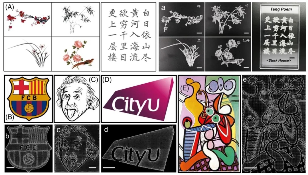 4. 3D打印类刺绣图案,采用MEW技术将传统花卉图案及标志(如巴塞罗那队徽、爱因斯坦肖像)转化为双层PLA微纤维结构(厚度≈54 µm)。结果显示,打印图案分辨率高,可实现艺术与技术的融合,验证了PLA在装饰性可穿戴领域的应用潜力。