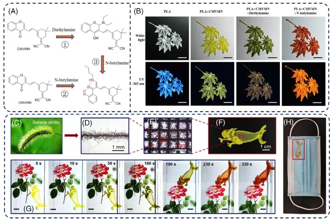 5. PLA-AIE化学传感器的荧光响应图,将CMVMN(一种AIE分子, Aggregate 2022, 4, e239.)掺杂在PLA基体中,制备出枫叶和变色龙形状的传感器。结果表明,该传感器在接触正丁胺和二乙胺蒸气时,分别呈现砖红色和深绿色的颜色,在UV光下荧光从浅黄色转为粉红色和橘色,实现胺类蒸气的可视化检测。