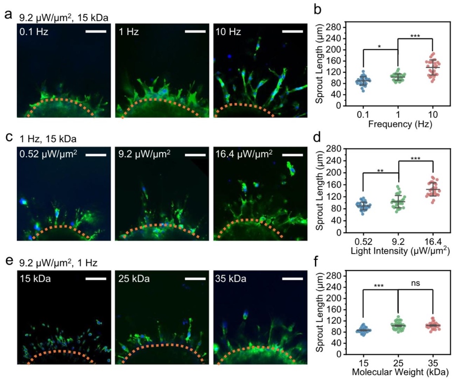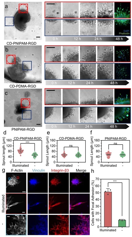 4. 不同条件下力诱导的细胞迁移图,通过设置不同实验条件对比分析的方法,研究了脉冲频率、近红外功率密度和致动器分子重量对细胞迁移的影响。结果显示,增加光照频率、功率密度或CD-PNIPAM-RGD致动器的分子量可显著增强细胞迁移,但超过一定阈值后,分子量增加不再有额外改善,且致动器轮廓长度影响对特定细胞受体的作用力大小。
