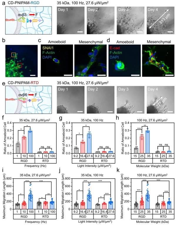 5. 高强度力作用下不同细胞迁移模式的示意图,通过实验观察与定量分析的方法,研究了CD-PNIPAM-RGD和CD-PNIPAM-RTD在高强度力作用下诱导的细胞迁移模式。结果表明,CD-PNIPAM-RGD在高频、大振幅力作用下可诱导明显的间充质-阿米巴样转变(MAT),而CD-PNIPAM-RTD在相同条件下几乎不诱导MAT,且细胞迁移速度低于前者。