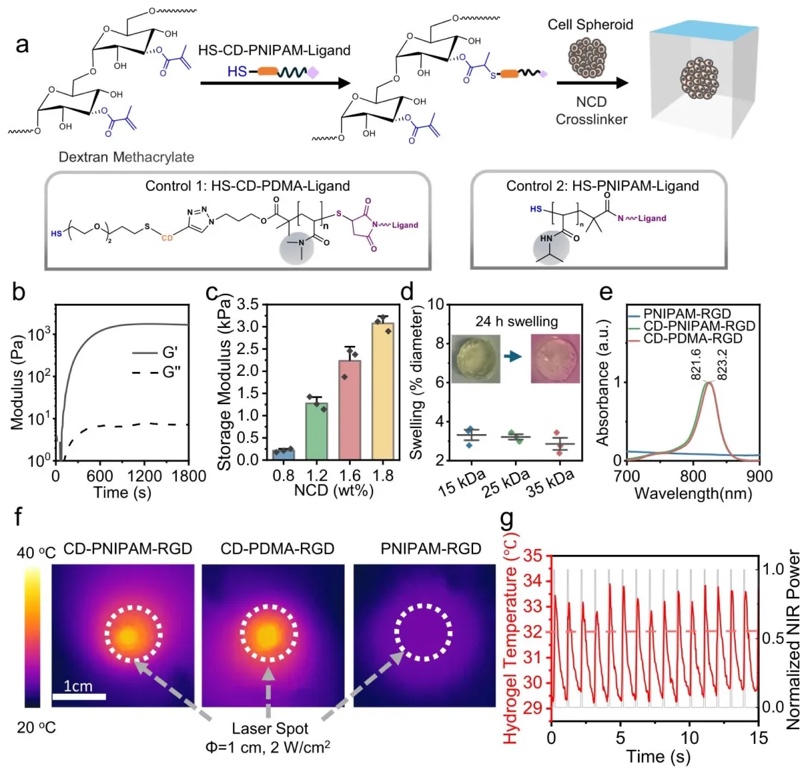 2. 大分子致动器功能化DexMA水凝胶的制备、力学及光热性能图,通过实验制备与表征分析的方法,研究了致动器功能化DexMA水凝胶的制备过程、力学性能和光热效应。结果显示,该水凝胶在近生理条件下15分钟内剪切储能模量达1.2 kPa,其力学性能可通过调整交联剂浓度在200-3000 Pa范围内调节,且CD基团赋予水凝胶良好的光热效应,近红外光照射可使其温度快速变化,触发PNIPAM构象转变。