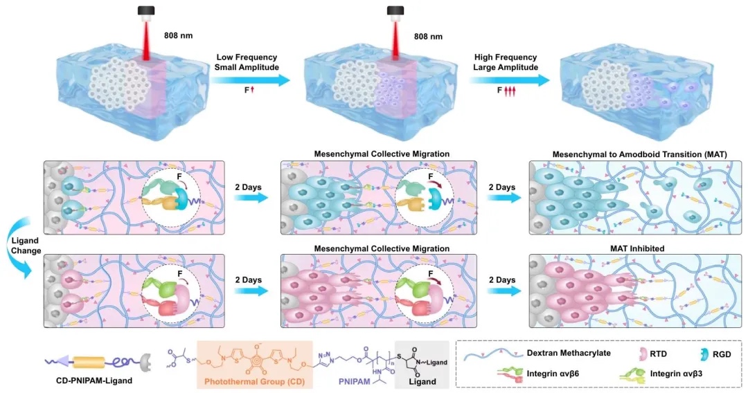 1. 3D水凝胶平台的设计与作用机制示意图,通过构建示意图的方法,研究了嵌入近红外响应大分子致动器CD-PNIPAM-Ligand的3D DexMA水凝胶平台的设计及其对癌细胞迁移的调控机制。结果表明,该平台利用近红外光照射使CD基团将光转化为热,促使温敏性PNIPAM链收缩并直接对细胞受体施加拉力,可通过不同配体(RGD和RTD)靶向整合素αvβ3和αvβ6,实现对癌细胞迁移的调控。