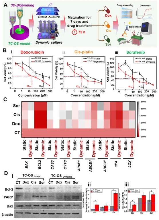 利用MTT法测定细胞活力,并结合基因和蛋白分析(如BAX、BCL-2、PARP-1等),研究TC-OS模型在静态和动态条件下对阿霉素、顺铂、索拉非尼三种抗癌药物的敏感性。结果显示,动态培养的模型对药物更为敏感,药物能更高效地诱导细胞凋亡,同时降低了耐药基因的表达。
