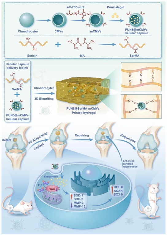 1. 细胞胶囊递送生物墨水的制备与应用示意图,通过构建负载石榴皮素的软骨细胞膜囊泡(CMVs)并与甲基丙烯酰化丝胶(SerMA)结合,制备出可光固化生物墨水,研究了其在ROS环境下用于软骨组织工程的可行性。结果表明该生物墨水能有效 scavenge ROS、促进软骨再生,且可通过3D打印形成具有高形状保真度的结构。