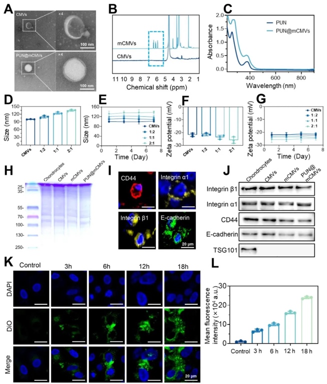 2. PUN@mCMVs的制备与表征图,利用透射电子显微镜(TEM)、核磁共振(1H NMR)、动态光散射(DLS)等方法,研究了改性CMVs负载石榴皮素后的形貌、粒径及稳定性。结果显示mCMVs呈杯状结构,平均粒径约100 nm,PUN@mCMVs封装率达67.8%,且在7天内保持稳定。