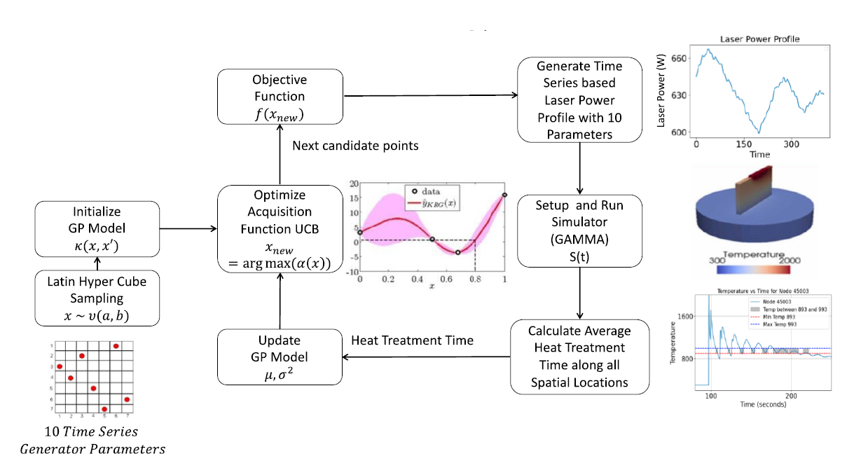 为了补充预测模型,研究人员开发了时间序列过程优化的贝叶斯优化(BOTSPO),这是一种用于确定随时间变化的最佳激光功率分布的数据高效算法。由于时间序列数据的高维性,传统的DED参数优化计算成本高昂。BOTSPO通过将激光功率曲线表示为仅由十个可调参数(包括振幅、频率、相位、线性趋势、季节性及其变化率)定义的修正傅里叶级数,解决了这一难题。