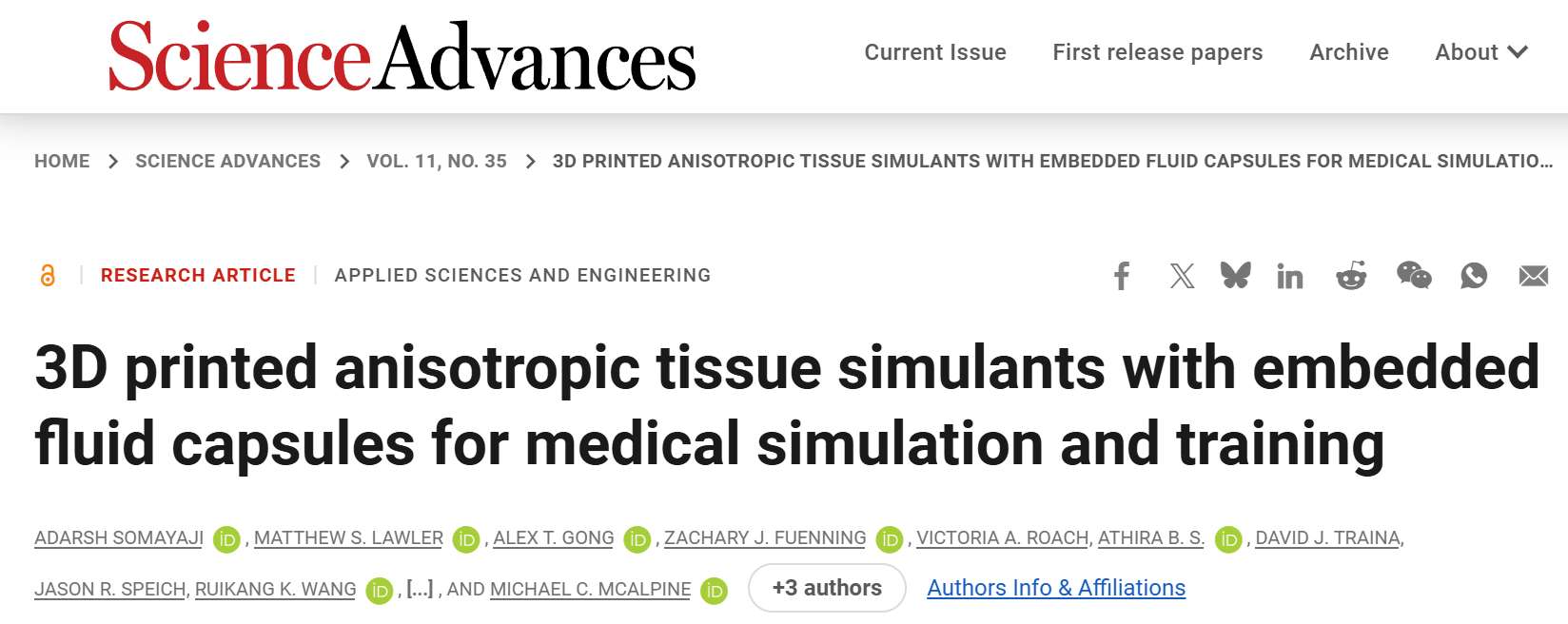 2025年10月15日,明尼苏达大学和华盛顿大学的研究人员开发了一种 3D 打印方法,可以复制人体组织的方向力学,为医学模拟和外科手术训练带来更高的真实感。相关研究以题为“3D printed anisotropic tissuesimulants with embedded fluid capsules for medical simulation and training”的论文发表在《科学进展》上。