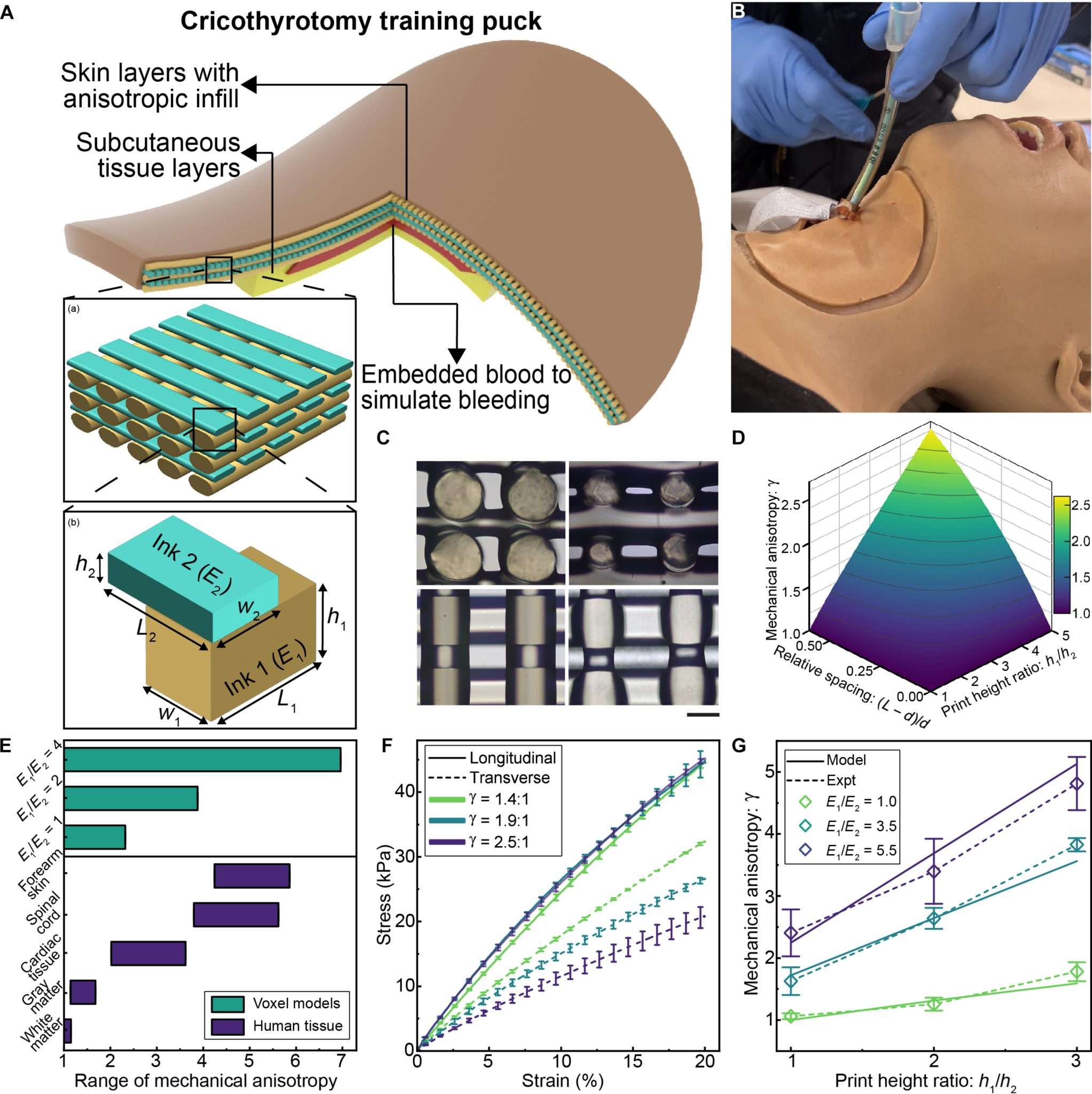 为了演示该方法,研究人员制作了一个3D打印的人体颈部组织模型,用于环甲膜切开术训练,这是一种高风险的紧急气道手术。模型被称为“环甲膜皮球”,由代表皮肤和皮下区域的多层硅胶组织组成,机械行为经过定制,以复制人体颈部组织的各向异性特性。