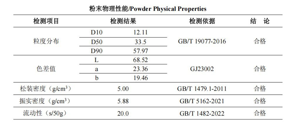 在粉体性能方面,该批次纯铜粉亦表现优异:实测数据显示,其粒径分布集中且均匀,D10=12.11μm、D50=33.5μm、D90=57.97μm,高度适配3D打印工艺需求;松装密度达5.00g/cm³,振实密度为5.88g/cm³,具备良好的致密化潜力;流动性指标为20s/50g,铺粉顺畅,有助于提升打印效率与成品致密度,减少打印过程中的缺陷产生。