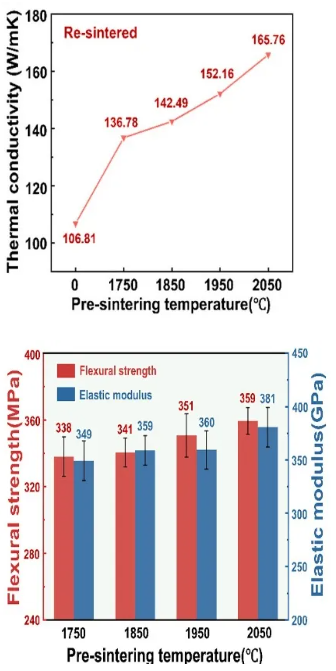 此外,为解决坯体强度低的问题,进一步引入预烧结处理工艺(1750-2050℃),在增强坯体强度的同时保持适量开孔结构,实现PCS高效渗透与缺陷控制。该工艺实现了双重突破:一方面在烧结过程中完全避免了游离硅相的生成,使材料具备优异的高温力学性能;另一方面通过PIP过程中形成的SiC骨架有效抑制了烧结收缩,将线性收缩率从21.71%大幅降低至6.38%。最终制备的SiC陶瓷密度达到3.17 g·cm⁻³,抗弯强度为359 MPa,弹性模量为381 GPa,热导率高达165.76 W·m⁻¹·K⁻¹,在1500℃高温环境下仍保持357 MPa的抗弯强度,为极端环境下使用的复杂结构SiC陶瓷部件的精密制造提供了可靠的技术支撑。
