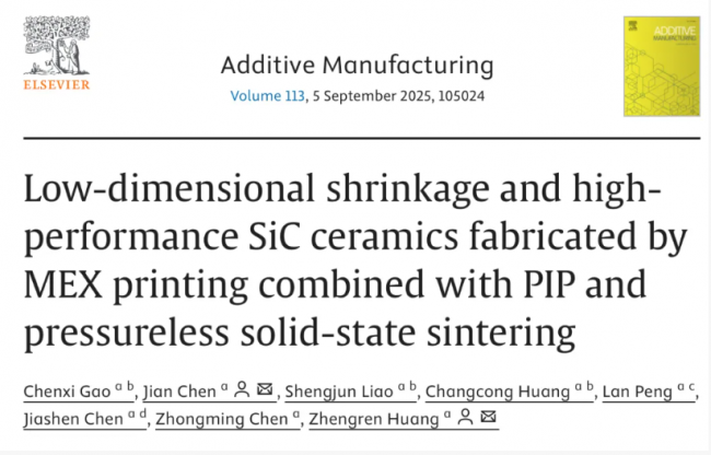 针对上述难题,中国科学院上海硅酸盐研究所黄政仁研究员团队陈健研究员创新性地提出材料挤出(MEX)打印结合前驱体渗透裂解(PIP)与常压固相烧结的复合工艺路线。