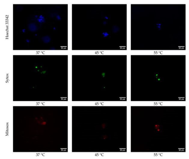 △高温会造成损害:荧光图像显示,随着3D生物打印样本暴露于更高温度下,应激水平升高,存活率降低。图片来自德克萨斯农工大学。