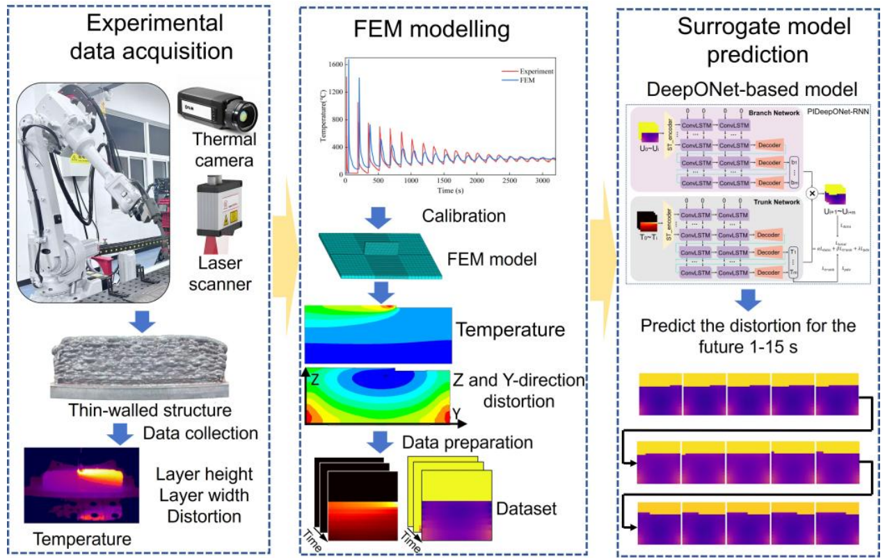有限元法 (FEM) 和计算流体动力学(CFD) 模拟能够捕捉到 WAAM 中详细的热力学响应,但需要大量的计算时间。FEM 通常需要几个小时才能模拟几秒钟的沉积过程,而 CFD 则可能需要数周时间。此外,每当工艺参数或几何形状发生变化时,这些模型都必须重新校准。诸如卷积神经网络 (CNN) 或时空 ConvLSTM 架构等机器学习替代方法提高了预测速度,但它们在长期预测精度方面存在不足,并且无法完全解耦驱动变形的相互交织的热场和机械场。