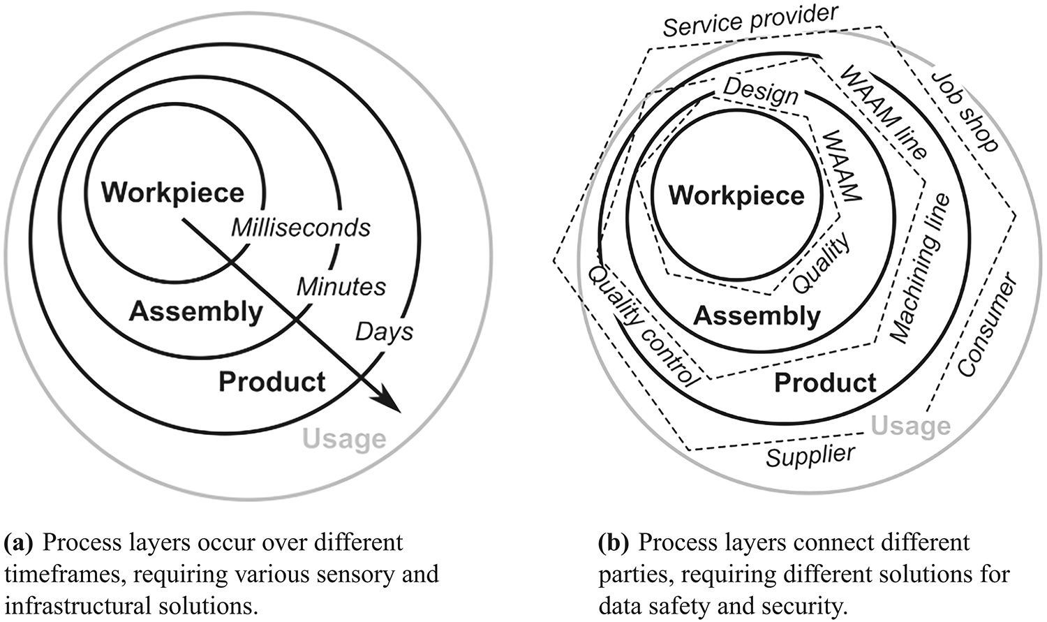 根据 ISO/ASTM 52900:2021 标准,WAAM 被定义为一种定向能量沉积(DED) 工艺,它利用电弧将金属丝熔化成近净成形的金属零件。虽然DED工艺本质上是数字化的,但在互联制造环境中的实际应用仍然有限。亚琛工业大学 (RWTH Aachen) 的框架在三个层面上明确了不同的技术和安全要求。工件层负责毫秒级的高频数据采集,这与产品质量和安全操作直接相关。装配层着眼于部门间和合作伙伴公司间的数据互操作性,需要明确的角色定义和受控的数据访问。产品层延伸至供应链,数据的真实性、长期可用性和隐私保护机制对于做出明智的决策至关重要。