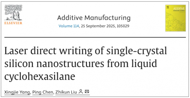 近日,上海交通大学机械与动力工程学院刘智崑副教授团队在增材制造顶刊《Additive Manufacturing》上发表重要成果,他们利用液态硅烷前驱体,结合激光直写技术,成功实现了全单晶硅纳米结构的快速增材制造,且特征尺寸突破了光学衍射极限。这一技术摆脱了对光刻机及电子束直写设备的依赖,为无需掩模、低成本制造三维半导体器件开辟了新路径。本期谷·专栏将分享该成果。