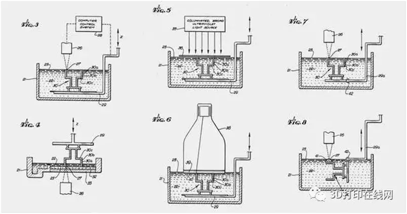 1984年Hull向美国专利商标局提交了立体光固化成型设备(SLA)的专利申请并获得专利授权,专利号为US4575330A。他在专利里面发明了术语“stereolithography”,简称SLA,也就是后来的立体光固化技术。在此之前,Hull 已经获得了多项荣誉,包括由美国总统拜登颁发的国家技术与创新奖章(NMTI,2023年)、入选美国国家发明家名人堂(2014年)、荣获欧洲发明家奖(2014年)、荣获制造业领袖终身成就奖(2016年),以及入选TCT名人堂(2017年)。此外,ASME还将SLA-1机器指定为历史性机械工程地标。