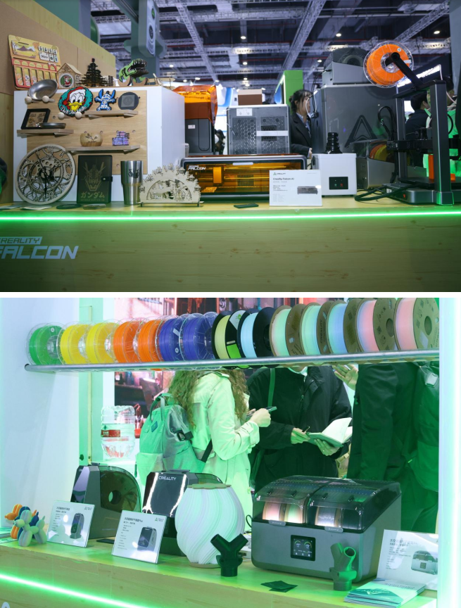 展会上,创想三维生态周边产品同样吸睛。Falcon A1 激光雕刻机,0组装开箱即用,通过自有品牌耗材二维码自动识别雕刻参数,搭配出厂标定的精准AI相机定位系统,实现“扫码即用+所见即所得”的零门槛高精度创作体验。Creality RaptorX 扫描仪,搭载多线激光融合技术,以0.02mm计量级精度和无线自由扫描重塑逆向工程效率,在极短时间内能把各种复杂模型扫进电脑,让3D建模变得更简单。4卷装太空盔耗材干燥盒X4凭借双舱四卷同步干燥系统与80°C主动除湿技术,实现材智能烘干及干燥剂循环再生,让打印耗材始终保持最佳状态。