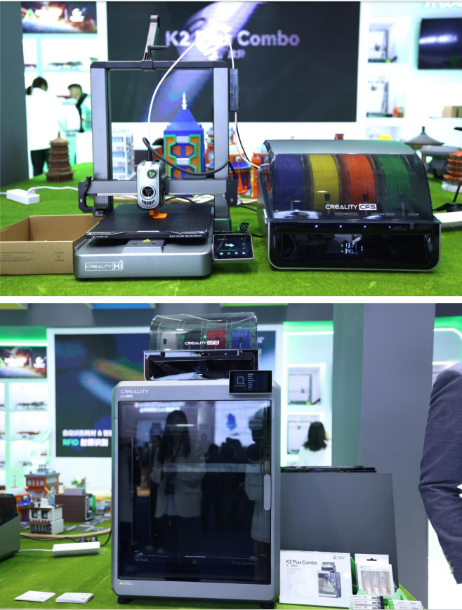 “贴近生活区”展示了3D打印在生活中的多元应用。K2 Plus Combo 搭载CFS智能耗材管理系统,支持多色打印与自动换料,配备5颗高精工业级FOC伺服电机,60℃腔体恒温环境可轻松驾驭ASA、PPA等高性能耗材,适用于大尺寸复杂模型制作。Creality Hi Combo经济实惠,兼容CFS系统,快拆喷嘴温控精准,铝合金骨架与线性导轨保障打印稳定,能满足家庭创意制作。此外,K1系列CFS 升级配件也首次在国内展会亮相。