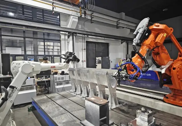 ▲李文龙主持研制的机器人测量-加工一体化智能制造装备